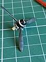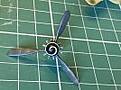 The balkenkreuz that needed fitting before I spray the green got fitted this morning before I went to work . Tonight theyve dried thoroughly so it was time to get the green blotches on .I turned the airbrush needle stop right in so there was only a fraction of movement and turned the air down a bit . The paint was thinned and a good few drops of flow improver added and off we went. I had to keep cleaning the needle tip and nozzle as the paint was drying on the needle and clogging but eventually got there . Ive assembled the prop and spinner / engine fan . The spiral on the spinner was a little short at the prop end so it was finished off with a touch of white .
