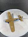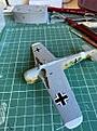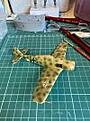 RLM79 now on and masking taken off. The white band under the fuselage was partially unmasked before the rlm 79 was sprayed , on the actual aircraft the band was sprayed over on the top side . The green mottles were also sprayed in the field and in places oversprayed the balkenkreuz on fuselage and wings not to mention the swastika on the tail ( which isnt supplied on either the airfix or revell decal sheets anyway ) . To achieve this I’m going to have to gloss the airframe at this stage and apply the decals before the mottle . Click image for larger version
