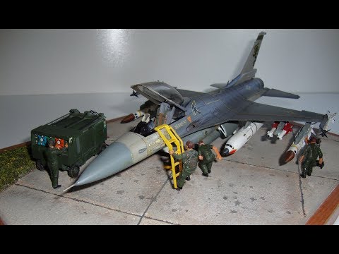 Here I bring you one of my first dioramas that I made several years ago. The main model is the F-16C Fighter Fighting Falcon which is being reviewed by operators. The whole set is made to 1/48 scale of the Hasegawa brand. To make this representation I wanted to include a set of missiles and another of track technicians.
