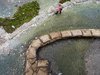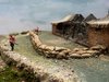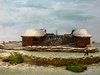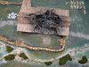The model is made from a cupboard shelf, scrap 20mm polystrene board from washing machine packaging, cocktail sticks, string, putty, scrunched up stone from the garden, moss from my flat roof and one crunched up weetabix. All painted in cheap 'tube' acrylics.......Not forgetting one lit Swan Vesta match - other makes are available!