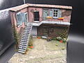 The pink walls and shallow roof make this real Italian looking Scottie. Gardening skills have improved tremendously. The way to counter the stark colour of the flowers is to add more of them which you have started with the trough. Add more ochre to the leaves to get that Mediterranean feel.