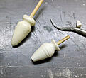 While I smell the smoke and dust from the snails overtaking me I started on the urn covers by slicing some plastic rod and rolling left over putty between my fingers for little ball bearing sized globes.