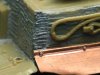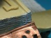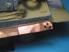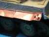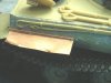 The thrown track builds up at the back end as the tank starts to roll to a halt after the hit. It should be veering to the right caused by the left working track but it can't avoid the rubble and side of the building and crashes into it. I didn't like the way the fenders looked and later replaced them with copper sheet. The turret busle wasn't armoured and was more like a storage bin and was easily damaged with dinks and perforation from gunfire.