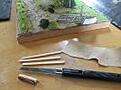 I thought that painting a figure would be a little taxing for today so i made a start on finishing the fencing i had planned for the gate, Yet again i've just dried out a twig and started to sand it down for a post. I'm not paying for something that nature (and storms) can provide for free.