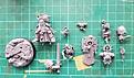 As I’m finishing a figure off this is my next character figure. I’m going to have to tackle this one as several separate parts. There’s the figure itself plus the head I’ve chosen. The base which also contains a destroyed Necron warrior, there’s the huge shield with its attached skeleton and religious artefacts and the there’s the sword arm. This is a power weapon so I’m trying a new technique to try and make this stand out.
