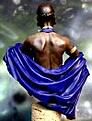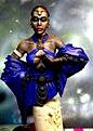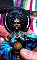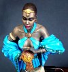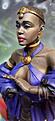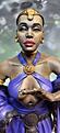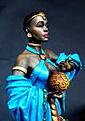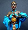 I've done some more skin smoothing - not there yet, but closer. I've taken her lipstick down a few shades, done the jewel on her sternum and slapped on a first coat of Vallejo dark blue on her dress.