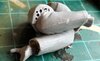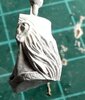 The basecolours all blocked in. At this time, dyeing of material was in general pretty drab, & the earth colours were most used ( at least for the ordinary Viking ) . The undertunic would be of linen, which was a light grey in it's unbleached state. He has a pouch on his hip ( behind his dagger ) - possibly for his comb & gaming stones. This may be made of sealskin, so I'll paint it to give a little variation. I added a peg to the oval base, to locate the legs.