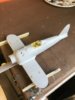 ID:	1101763intake under the nose can be tackled now . This goes under the cowling and runs along under the fuselage to behind the undercarriage legs. This is the reason I didn’t bother too much with the seam on the underneath of the front fuselage as it will be covered up. Problem is it’s slightly too short and the end is a square section , it should finish flush with the front of the cowling and have a semi circular section at the front end. I’ve glued a piece of large diameter styrene tube on to the front and when this is set I can shape it and cut it . I’ve also put the first struts on and fitted the windscreen . The screen was a strange one , having the raised lines for the frame on the INSIDE! I’ve painted these the cockpit colour and will have to sort the outside ones later, probably after painting.