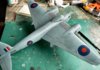 Once I had worked out the correct thinning ratio ( needed thinning about 40-60 ), it sprayed well & evenly. Next a gloss coat for the decals, such as they are. and a light wash ( not many panels on the wooden Mossie ).