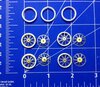 On the right, two new ones were made and Olga didn't let me down either. The 2 rings on the top left are the trials to get the right size for the etch spokes to fit in. The 2 rings on the bottom left were made for the inside discs. I cut them down so i didn't have to spend so much time sanding the tire into shape before making the tread pattern (see right). In the morning, I can cut out the tire discs and then bust this out and glue the spokes together,