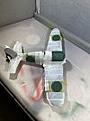 Well i had a bugger of a job trying to mask the white outline on the wings and fuselage. First i tried a smaller circle with the wide tape but just couldnt get it central enough , and the slightest off centre shows up like a sore thumb. I ended up cutting some thin strips ( about 1- 2 mm) and going round the edge to mask the border . The meatballs under the wings dont have the white edge so they were easy . Anyways here it is unmasked , just a few tiny tidy ups to do , the next job is the anti glare panel and then its chipping time . Meatballs and chips anyone!Comment