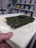 Decided to attempt to glue the turret sides together, a complete load of oop: would the roof fit, no ! Ok at the back but out a the front leading edge. This in turn threw the front out and left a large gap at the top. Having wrapped the whole thing up in tape to try to hold it while the glue dried, I then found that I'd hadn't prepared the back section to take the metal barrel. At this point I hacked the front of the plastic part of the gun off, yes you guessed it, the complete breach and gun snapped off the internal mounting. So now no breech to be seen from the open door, the front with the metal barrel is on. Squadron green filler to most of the edges of the turret. Oh just to compound things one section of curved track has come apart ! Just not my day.