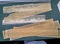 The master was made from strips of plastic care of EMA Supples, The cross joining bits also the same but cut to length with a 'Chopper' which at the end gave up and died (not really). I first made one length, then cast a rubber mould from that. I then cast two of the same from resin and joined them to make one strip/length and cast another mould. Then I went to the illustrations and drawings and realised my mistake I had made the gaps to wide across. So out came the saw and it was just a case of cutting each length down to the width I required (see to of photo) and re-gluing each length onto some thick card to preserve the shape and give the whole some strength as can be seen from the tattered end of one length. Then a final mould was cast and once happy I went ahead and cast the tradways from that in resin. This has taken place over a matter of weeks swapping from the hull build to the treadway, giving me a break and time to think out the problem. And once the hull is complete then it will be onto the bridge and I will show one side and then vanish to complete the others then the final assembly will be posted.