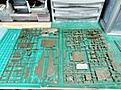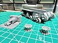 Wheelie stuff put on, the front end put together,(the bit resting on the cutters),and the engine/driver's compartment laid out, ready to ram together .... Next....