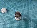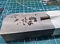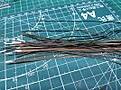 Here you can see the strips being fed through the tube which has been taped to a spare piece of wood, the length (3mm) has been measured out and with a sharp knife blade cut into the relevant lengths. For cutting I used a #10 round scalpel blade and used a rolling motion to cut the bits to stop them flying all over the place.
