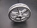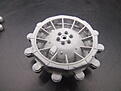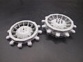 I have been working on the road wheels. The spoked ones including the idlers have been done. I have distressed the rubber tyre to show wear and tear. Also done is one of the sprockets. The first picture is a comparison of the weak detail on the kit part. Also missing from the kit part were all the bolts that held the rubber pads in place.