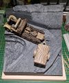 I also carved into the mountainside next to the uppermost wall to show damage by falling rocks and flowing water. Again, this still requires more work. The tops of the walls have yet to be worked on. They will have damaged top stones which I need to make out of thinly sliced foam. Another far easier process with a foam cutter:tongue-out3: