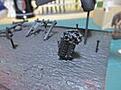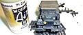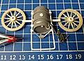 Wheels are ready for paint, as is the main tank/frame too. I added the the hex nuts and bolts on the strap holders. I wanted to thread them, but found my tap & die set didn't go down to 0.6mm size, only 4mm...Pump handle and pump is painted and the support cables added using 0.01 rigging from MIG. The most fun was threading it through the brass tubing........NOT!!!...........It's getting there....