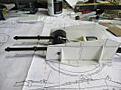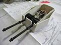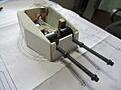 HI ALL well the build is still goin on heat or no heat as here im now just putting te 6inch guns into there trinion blocks i think they are called now to cut out the sides where there will be a shaft hole on each side to take the axle bar so guns can elevate up an down but not doin this on the small 3 inch turret as not enough room top veiw