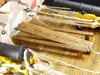 The kit would have you choose between mess tables and benches or seamen's hammocks. Although probably inaccurate I decided to have one side set up with the table and the other side with hammocks. Only the table and benches done so far. The rope will tie to the beam above to level the table.