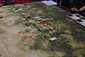 Not really into table to wargaming, but saw this one, which is based on WW1 dogfighting using little biplanes etc and each action based on the turn of a card, called Wings of Glory....