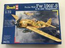 Heres the Revell FW190 f-8 with BV246 Hagelkorn glide bomb , not a totally modern release ( tooled in 1997 but with extra parts in 2008 ) but still widely available. The box features a nicely done picture of an f-8 variant in spotty desert camo . The end opening box contains three sprues in a light grey blue plastic and two clear sprues ,each with a canopy and screen ( one blown , one flat ), instructions and decals.