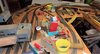 Still sorting out south end but finished laying out mine module & nailing down south inner grade loop violating grade std a bit to get under yard grade. Full stop. Have run out of rail connectors. Poor planning on my part. Thought I had stashed more. I should have used more "flex track" but instead used individual Atlas pieces for speed. So now have used up most of the Atlas tracks but have run out of connectors & have lots of flex-track left over. Duh.