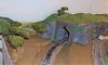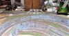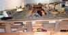 Trying to figure out south tunnel exit on the South 4th curve/straight before ballasting it. Lower access road was a spermodamomentthang so not well thought out. You might notice a portion of the four'n'ahaf foot bridge complex that was going to bridge the cut or hold the fourth curve/straight, but couldn't work out the supports, so back in the box it goes.
