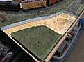Today I worked on my Coal yard. I removed the old Coal and grass underneath and saved it. Then I applied the ground cover and added the “Coal” which is colored sand. I left a few bare spot to show where the dirt has worked it’s way through the Coal lot I will feather in the old and new Coal when this dries. Click image for larger version