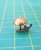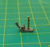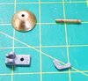 The cable car bell sits atop the front of the cable car. Here it is made up of five tiny parts. The bell, base, clapper arm (the piece that bashes the bell), a vertical stand, and a pin that hinges the arm and base.