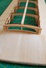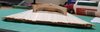 Next day, the dry strips were cut to length the ends and then shaped. The curves were drawn using a circle template and then roughly cut using a saw. A sanding finished the corners and ends. Looks symmetrical to me!